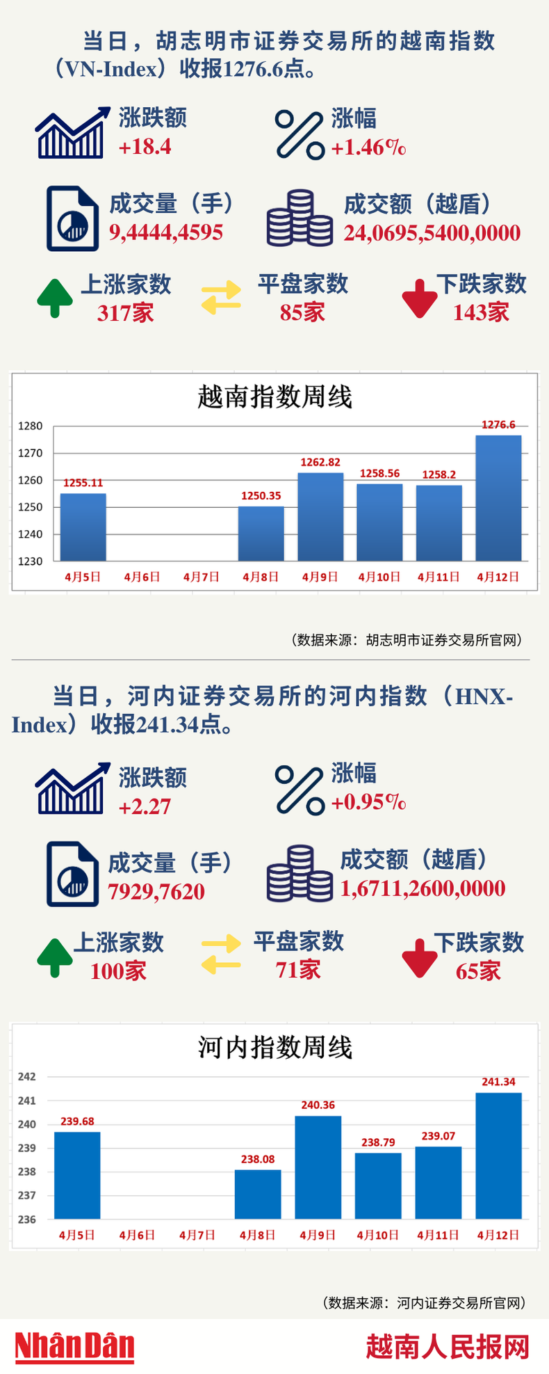 当天,胡志明市证券交易所的越南指数(VN-Index)和河内证券交易所的河内指数(HNX-Index)分别收报1276.6和241.34点。