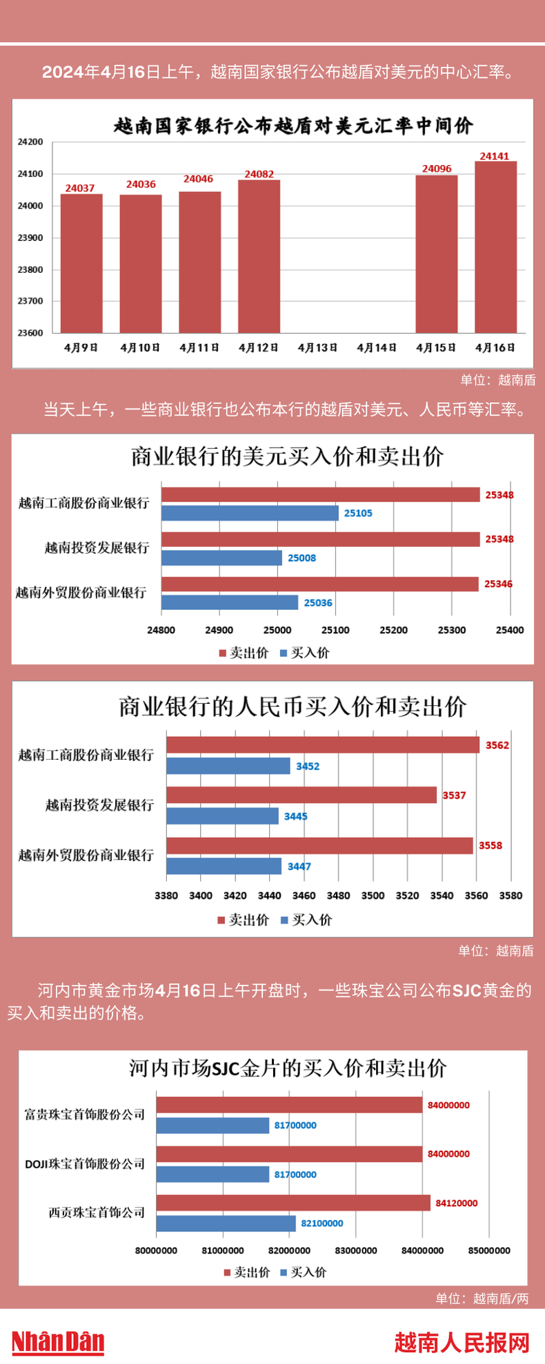 2024年4月16日上午,越南国家银行所公布的越盾对美元的中心汇率为24141。