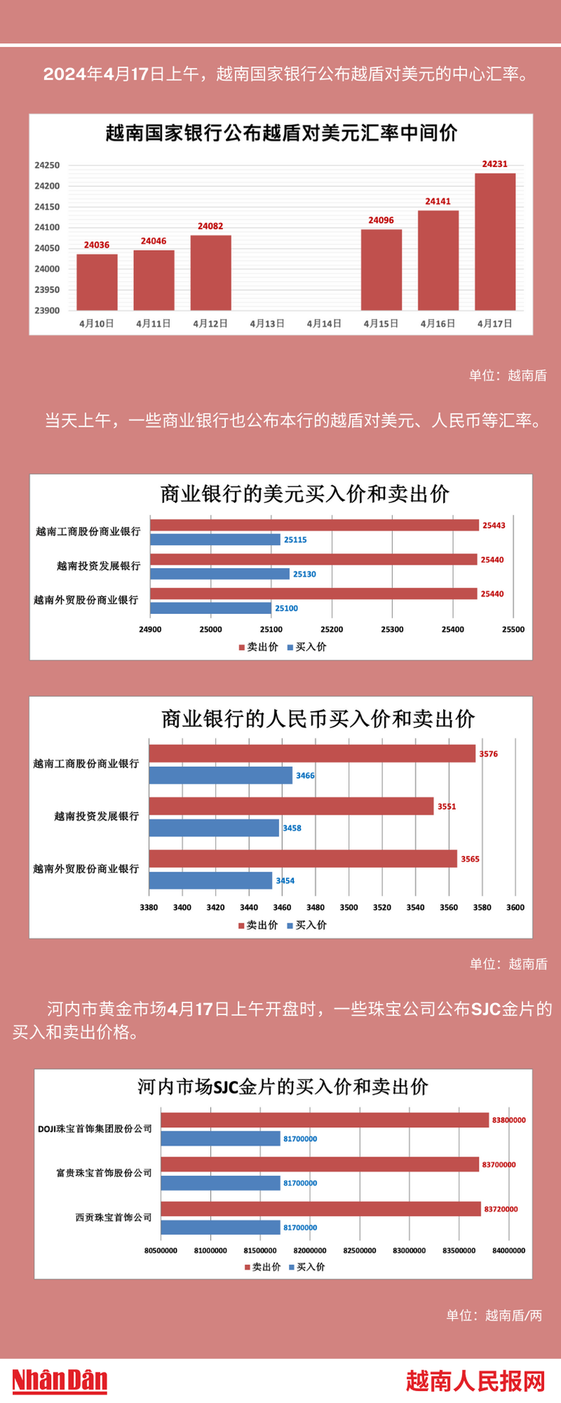 2024年4月17日上午,越南国家银行所公布的越盾对美元的中心汇率为24231。
