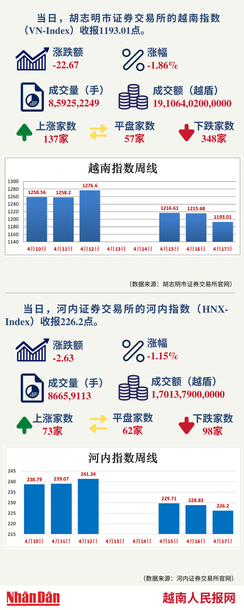 当天,胡志明市证券交易所的越南指数(VN-Index)和河内证券交易所的河内指数(HNX-Index)分别收报1193.01和226.2点。
