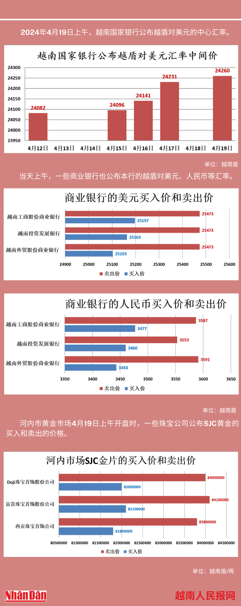 2024年4月19日上午,越南国家银行所公布的越盾对美元的中心汇率为24260。