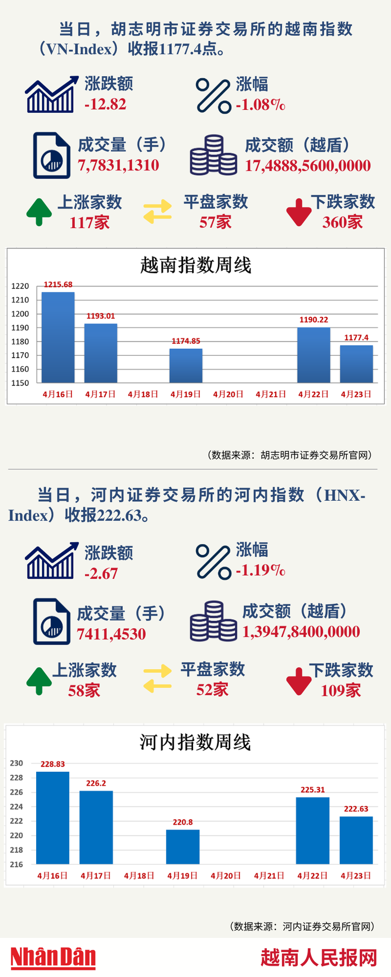 当天,胡志明市证券交易所的越南指数(VN-Index)和河内证券交易所的河内指数(HNX-Index)分别收报1177.4和222.63点。