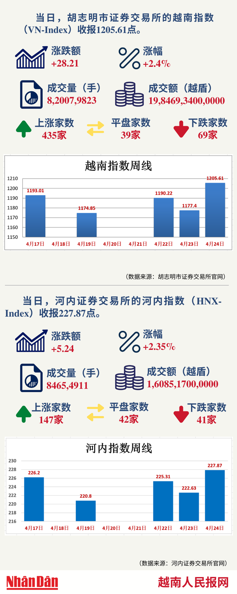 当天,胡志明市证券交易所的越南指数(VN-Index)和河内证券交易所的河内指数(HNX-Index)分别收报1205.61和227.87点。