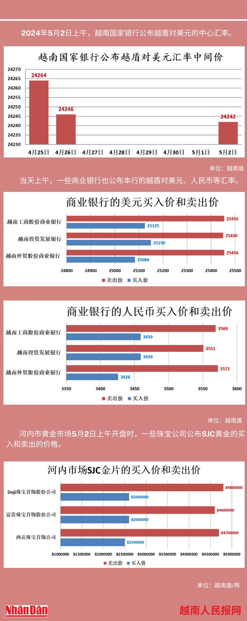 2024年5月2日上午,越南国家银行所公布的越盾对美元的中心汇率为24242。
