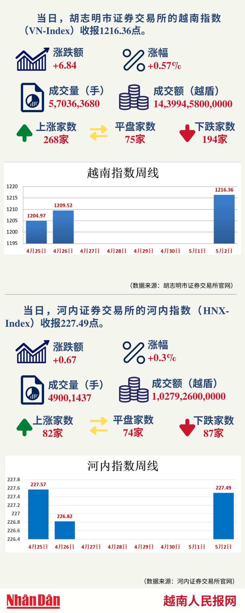 当天,胡志明市证券交易所的越南指数(VN-Index)和河内证券交易所的河内指数(HNX-Index)分别收报1216.36点和227.49点。