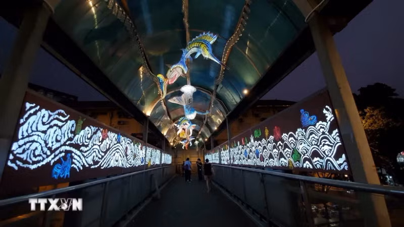 陈日燏人行天桥是连接河内古街和还剑郡清安口岸的福新区的人行通道。武春东、黎登宁、艮文恩等艺术家和策展人阮世山将这座人行天桥变成了一座更加欢乐、活泼且的桥梁,灯光装置公共艺术照亮街道与建筑物,打造了光与影的奇幻美。