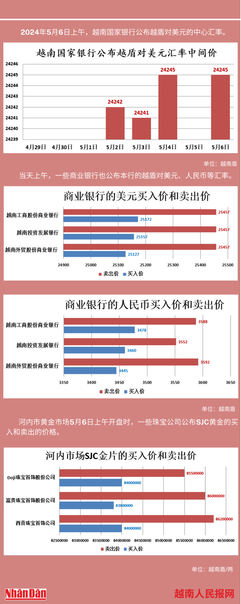 2024年5月6日上午,越南国家银行所公布的越盾对美元的中心汇率为24245。