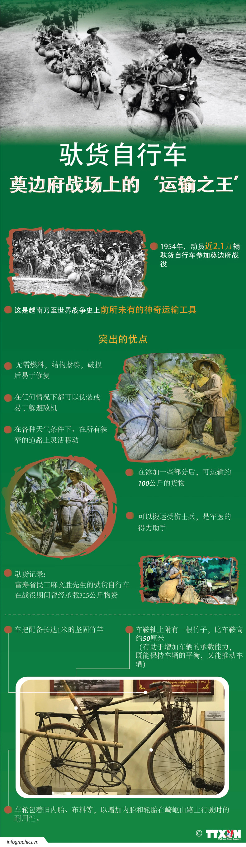 驮货自行车是1954年奠边府战役取得胜利的‘贡献者’之一,曾经被誉为战场上的 ‘运输之王‘。在奠边府战役中曾经动员了2.1万辆驮货车,越南军民已创造出‘奠边府’的奇迹。