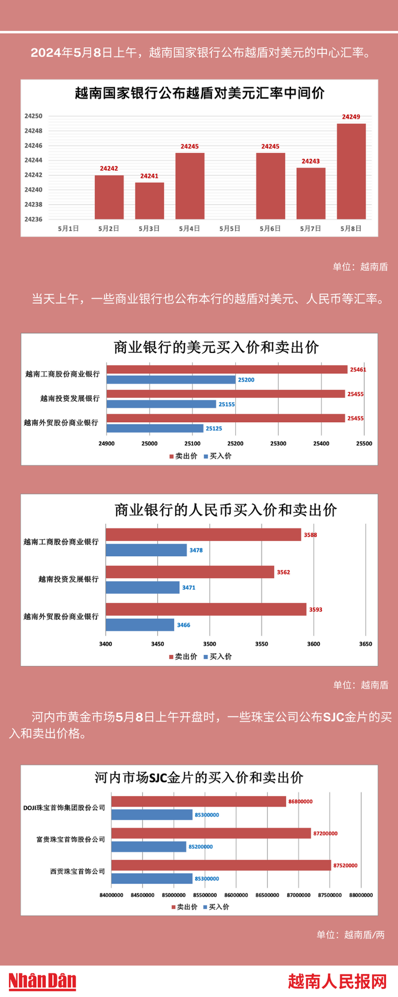 2024年5月8日上午,越南国家银行所公布的越盾对美元的中心汇率为24249。