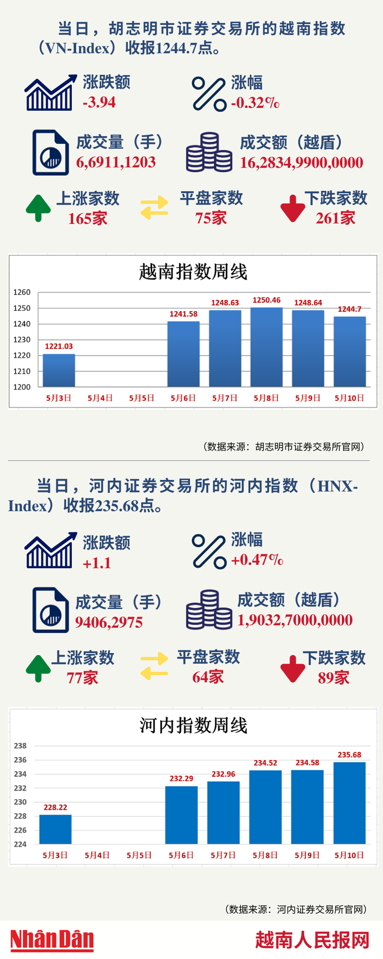 当天,胡志明市证券交易所的越南指数(VN-Index)和河内证券交易所的河内指数(HNX-Index)分别收报1244.7和235.68点。