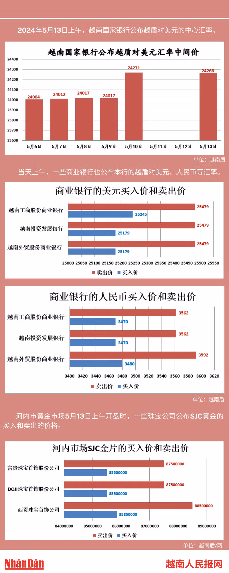 2024年5月13日上午,越南国家银行所公布的越盾对美元的中心汇率为24266。