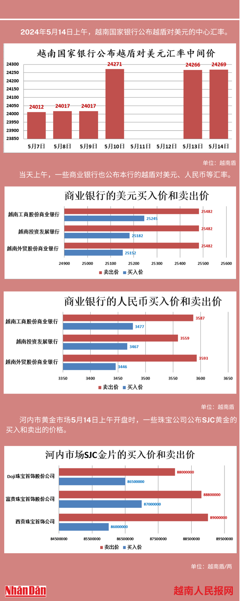 2024年5月14日上午,越南国家银行所公布的越盾对美元的中心汇率为24269。
