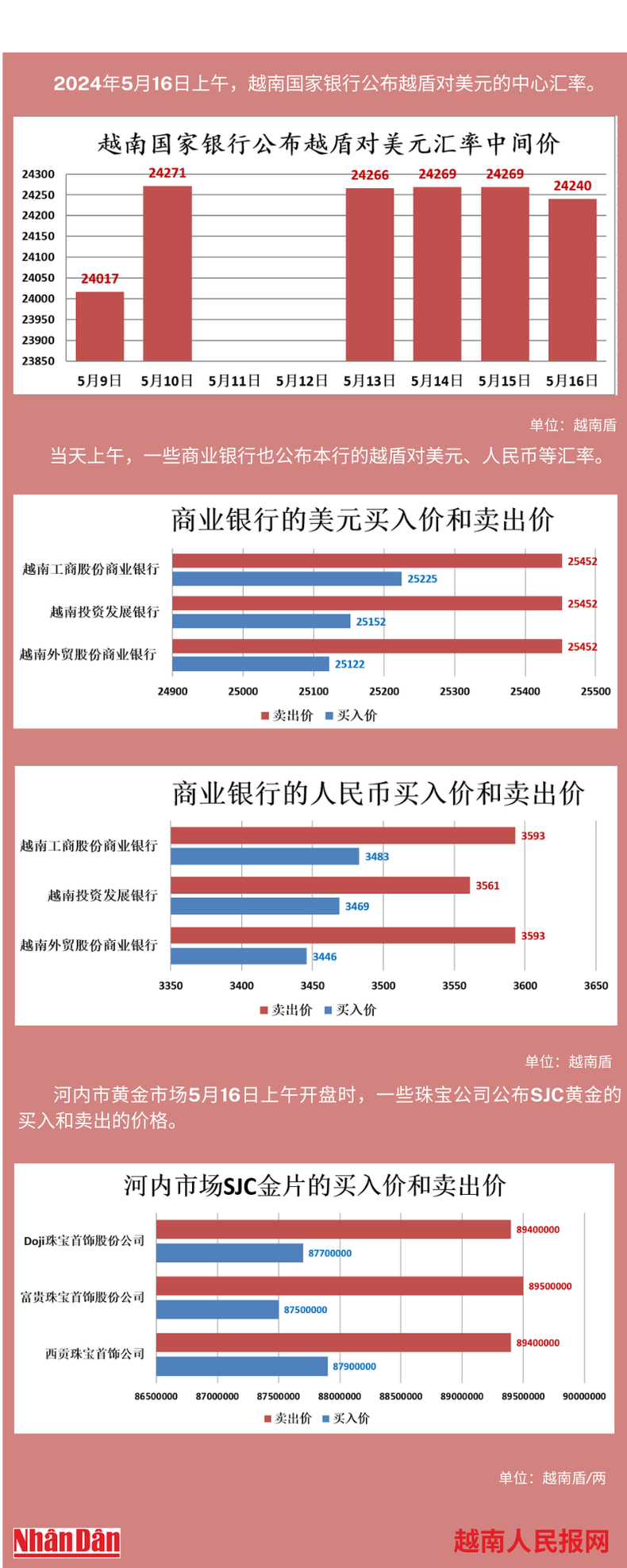 2024年5月16日上午,越南国家银行所公布的越盾对美元的中心汇率为24240。