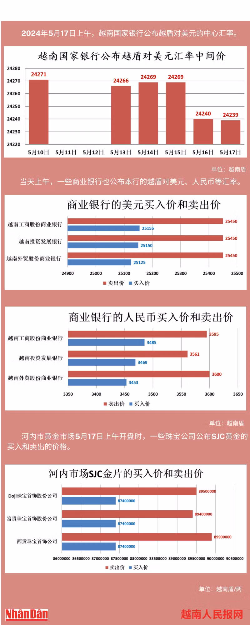 2024年5月17日上午,越南国家银行所公布的越盾对美元的中心汇率为24239。