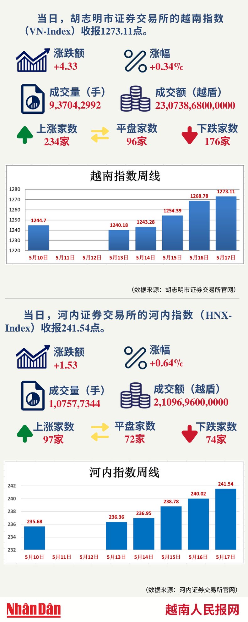 当天,胡志明市证券交易所的越南指数(VN-Index)和河内证券交易所的河内指数(HNX-Index)分别收报1273.11和241.54点。