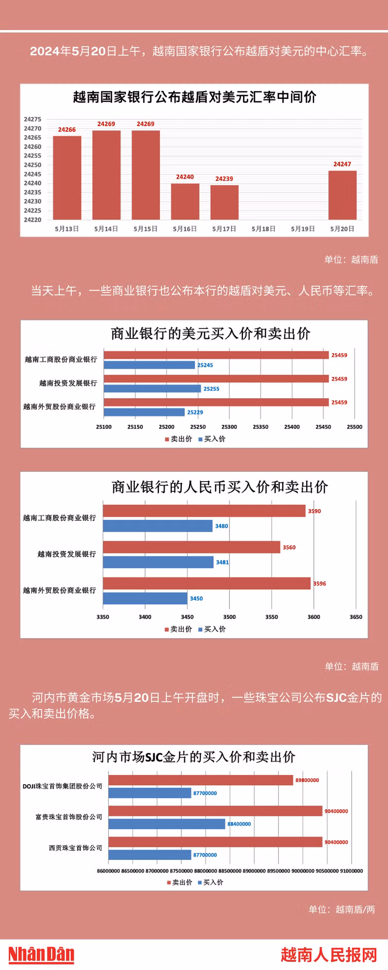 2024年5月20日上午,越南国家银行所公布的越盾对美元的中心汇率为24247。