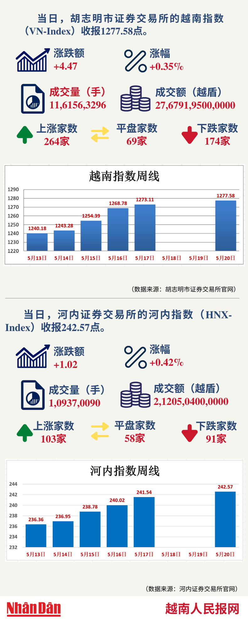 当天,胡志明市证券交易所的越南指数(VN-Index)和河内证券交易所的河内指数(HNX-Index)分别收报1277.58和242.57点。