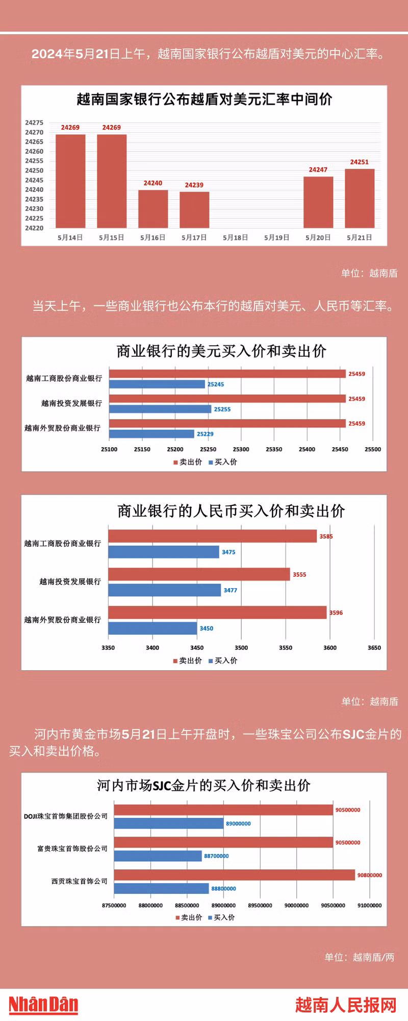 2024年5月21日上午,越南国家银行所公布的越盾对美元的中心汇率为24251。