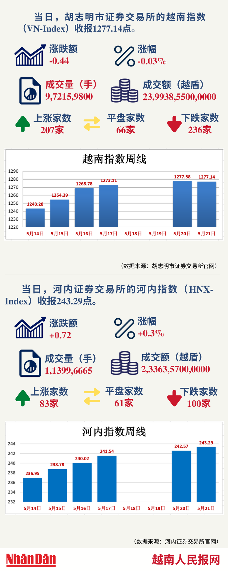 当天,胡志明市证券交易所的越南指数(VN-Index)和河内证券交易所的河内指数(HNX-Index)分别收报1277.14和243.29点。