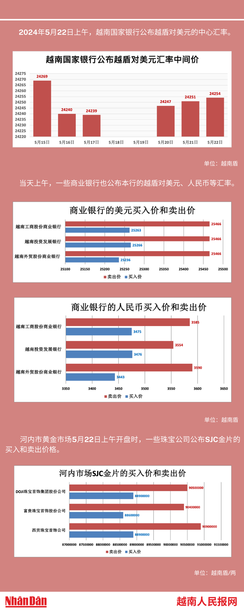 2024年5月22日上午,越南国家银行所公布的越盾对美元的中心汇率为24254。