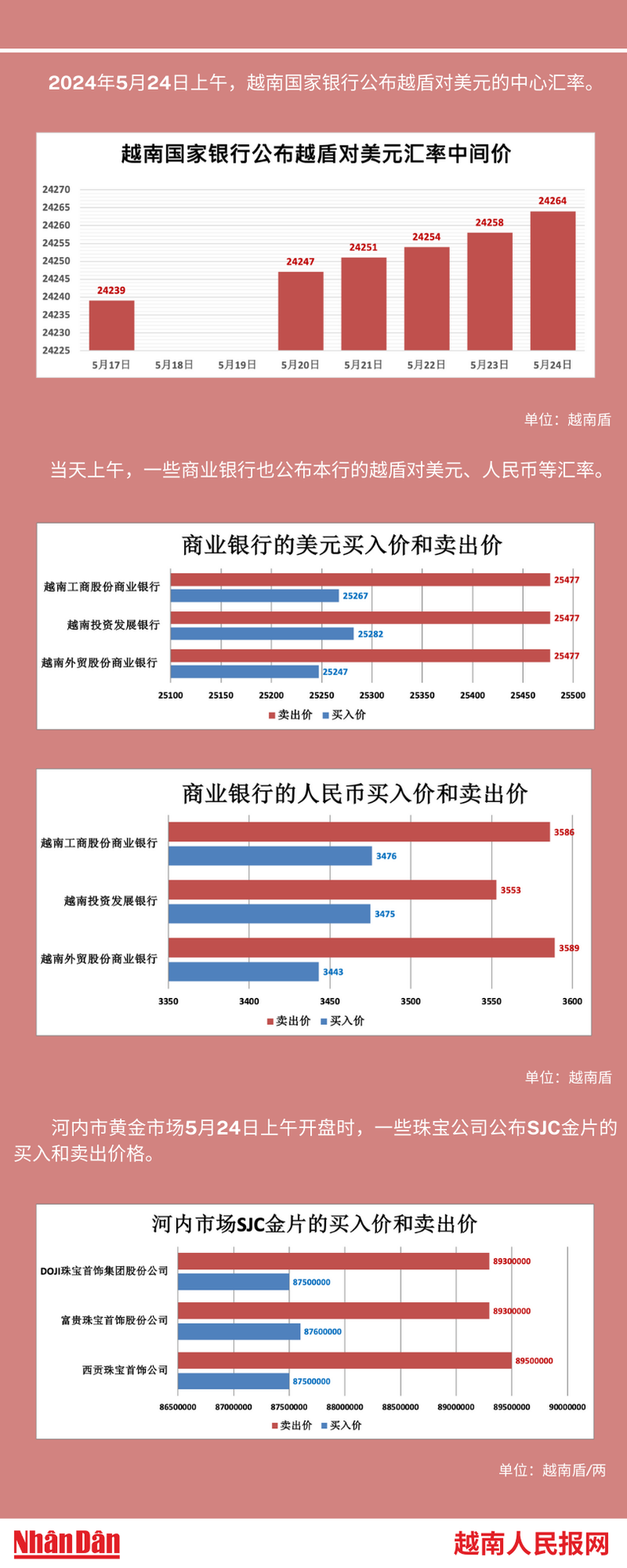 2024年5月24日上午,越南国家银行所公布的越盾对美元的中心汇率为24264。