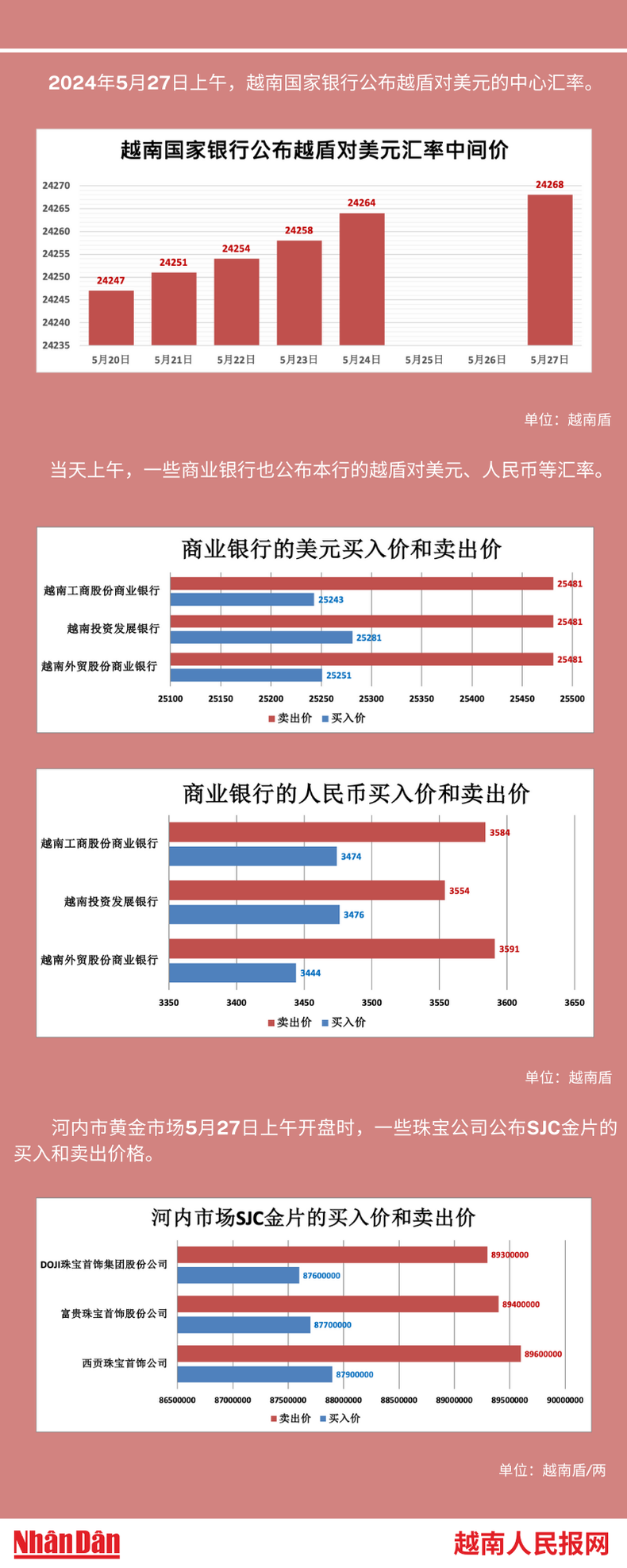 2024年5月27日上午,越南国家银行所公布的越盾对美元的中心汇率为24268。