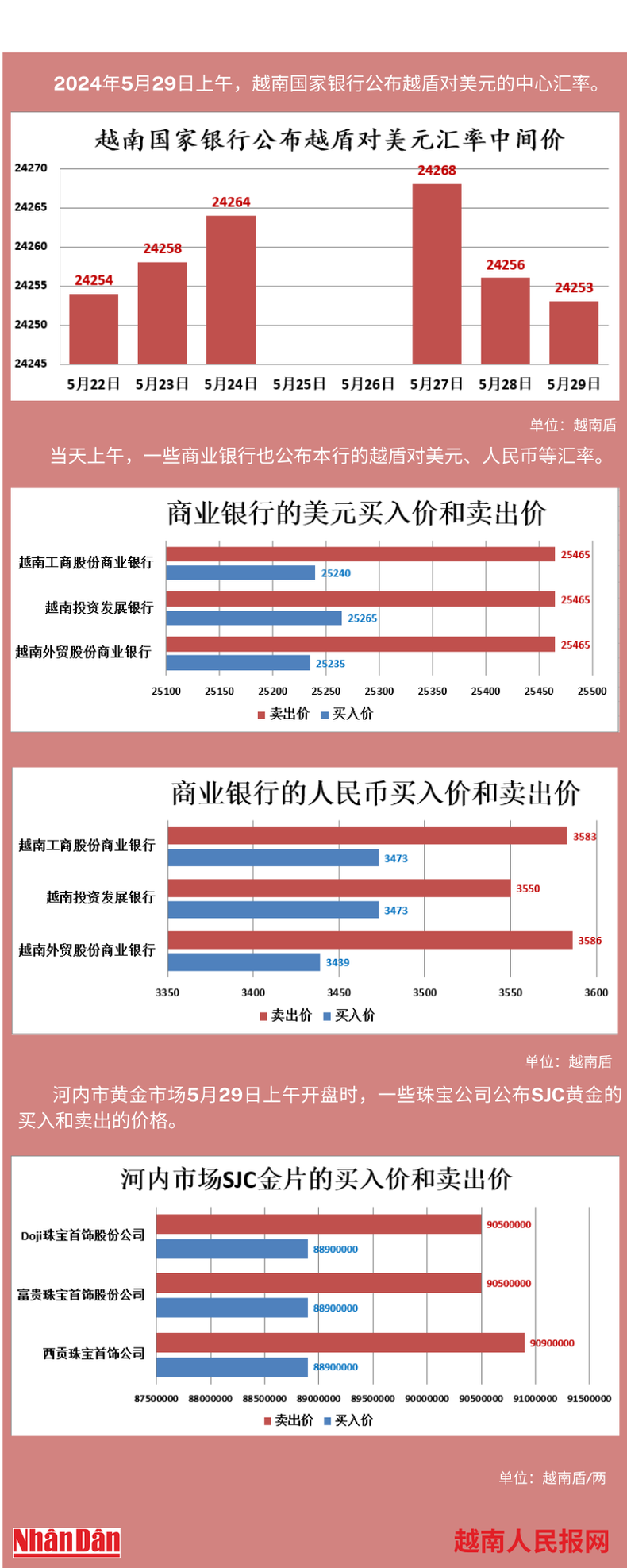 2024年5月29日上午,越南国家银行所公布的越盾对美元的中心汇率为24253。