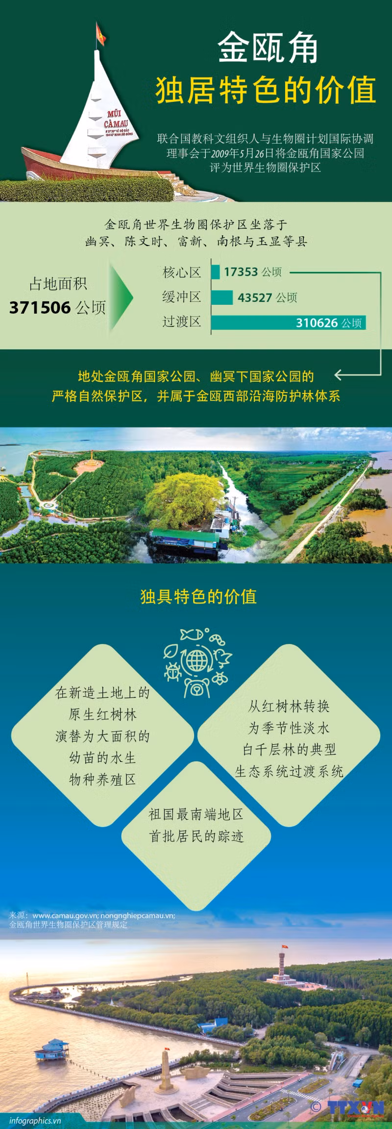 金瓯世界生物圈保护区总面积371506公顷。被公认为世界生物圈保护区有助于保护红树林生态系统的生物多样性、保护其人类价值,为实现可持续发展目标标做出重要贡献。