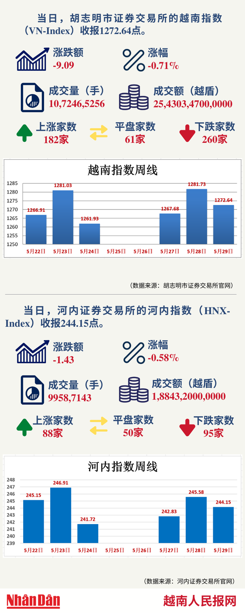 当天,胡志明市证券交易所的越南指数(VN-Index)和河内证券交易所的河内指数(HNX-Index)分别收报1272.64和244.15点。