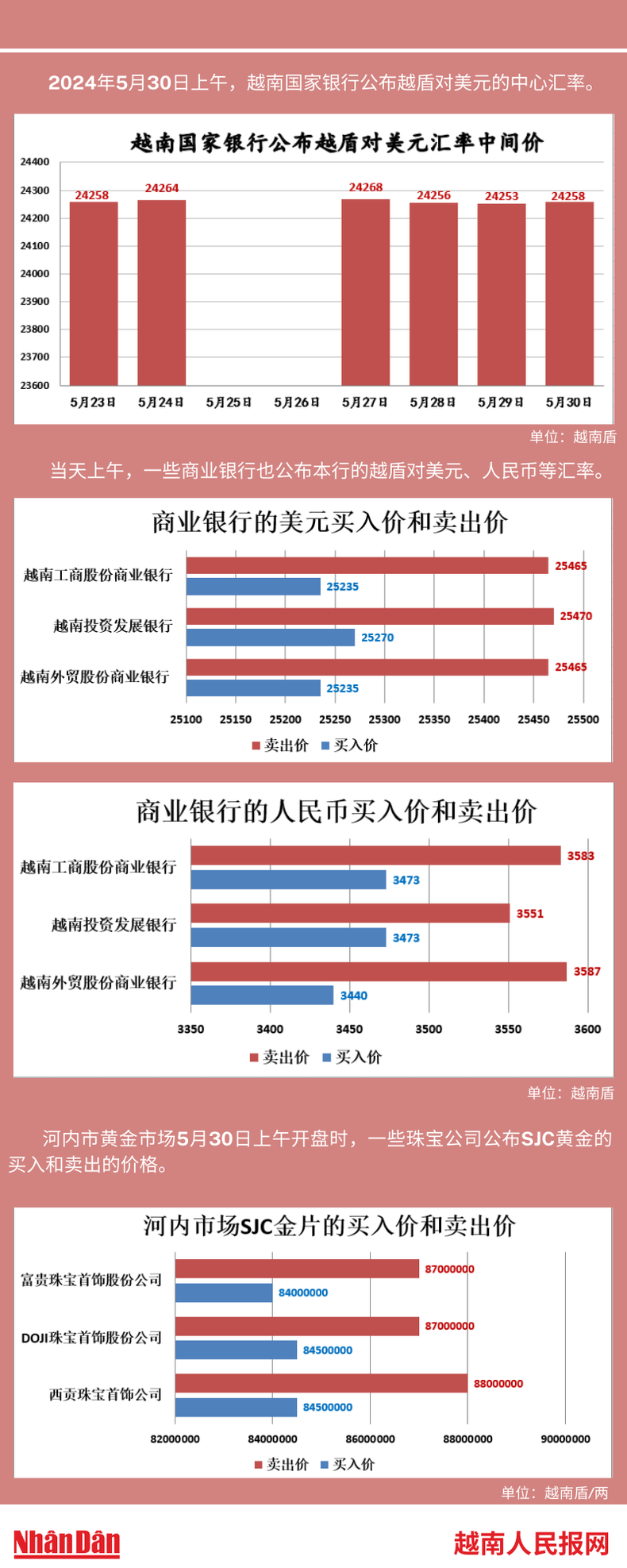 2024年5月30日上午,越南国家银行所公布的越盾对美元的中心汇率为24258。