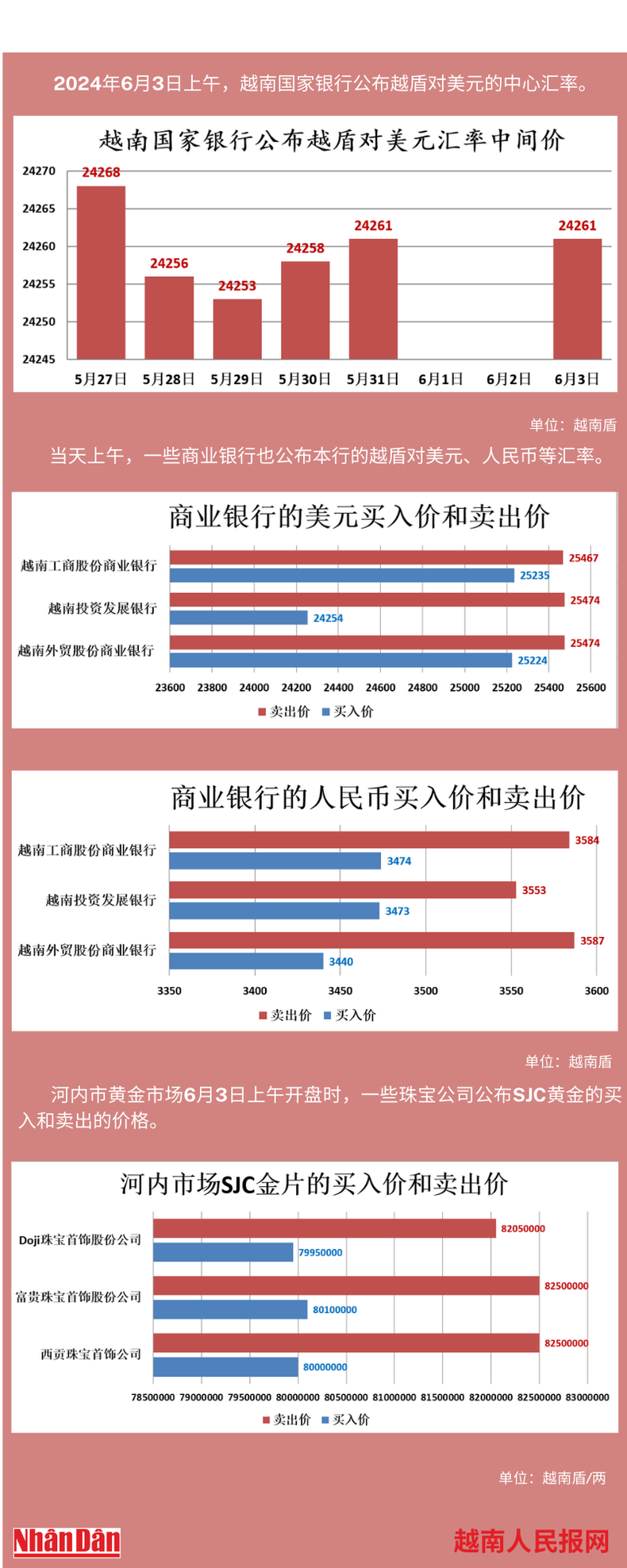2024年6月3日上午,越南国家银行所公布的越盾对美元的中心汇率为24261。