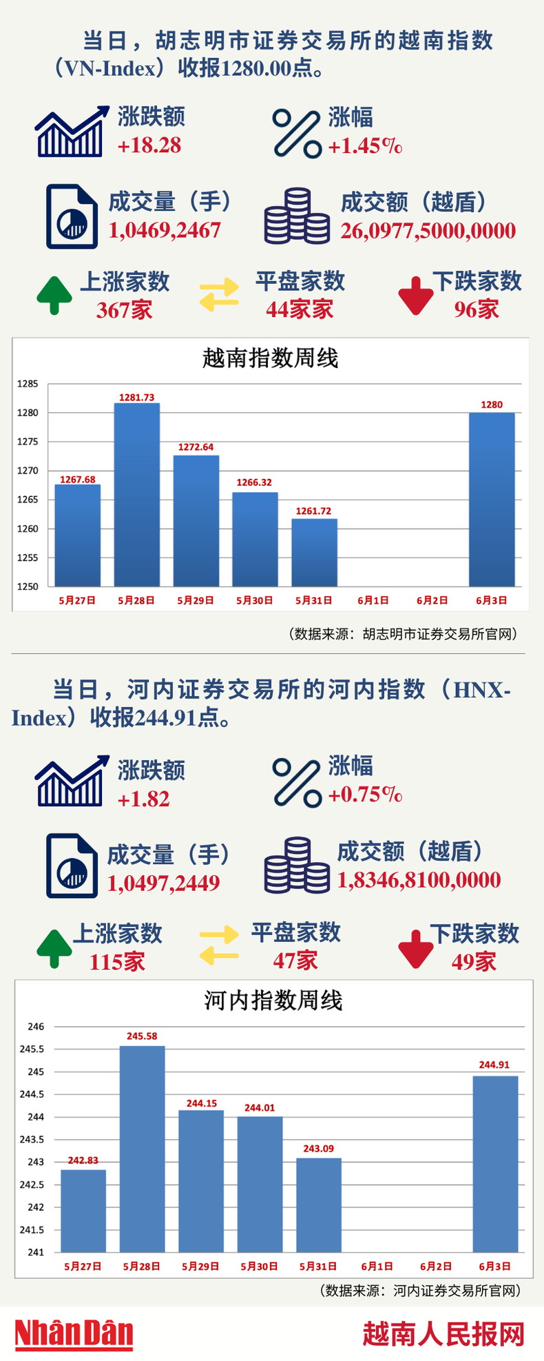 当天,胡志明市证券交易所的越南指数(VN-Index)和河内证券交易所的河内指数(HNX-Index)分别收报1280.00和244.91点。