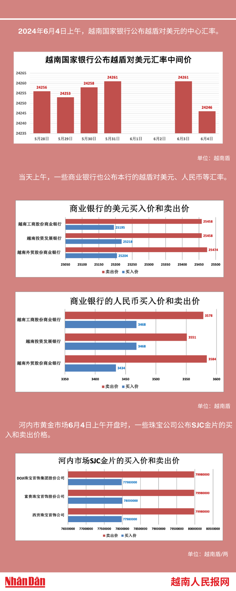 2024年6月4日上午,越南国家银行所公布的越盾对美元的中心汇率为24246。