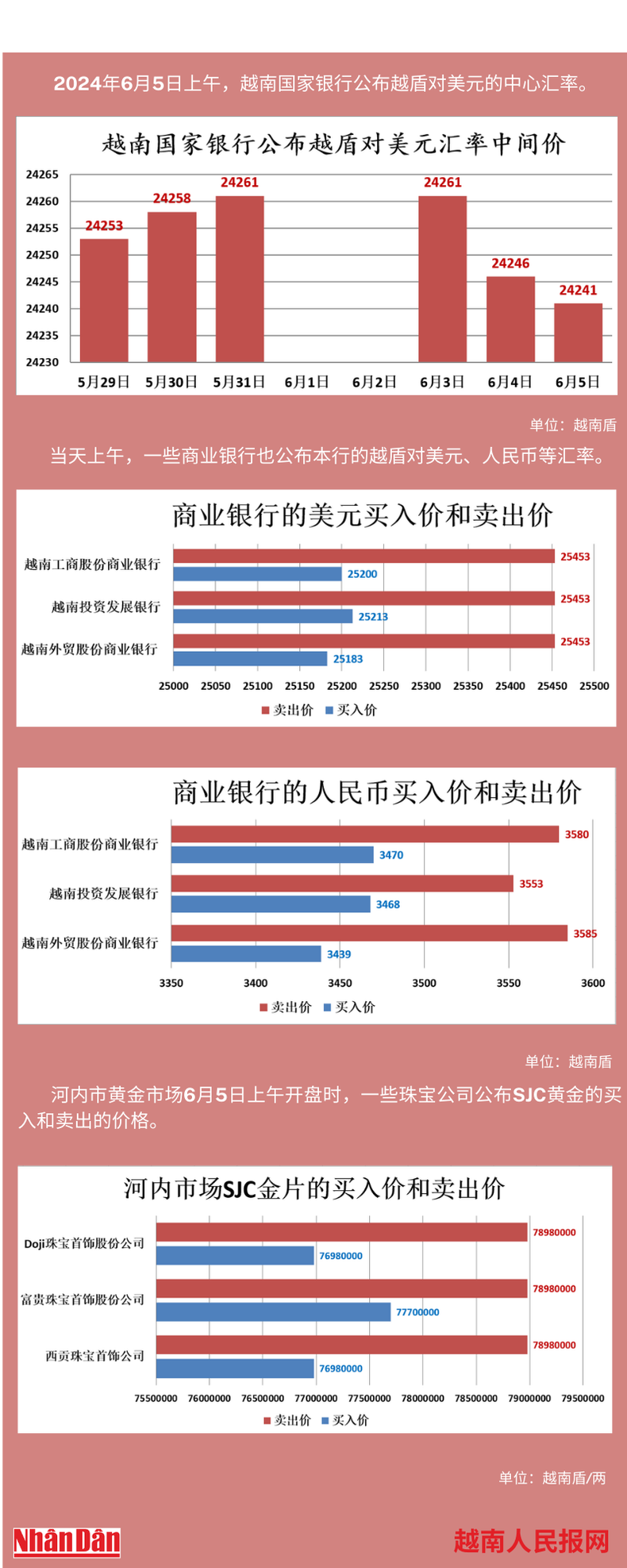 2024年6月5日上午,越南国家银行所公布的越盾对美元的中心汇率为24241。
