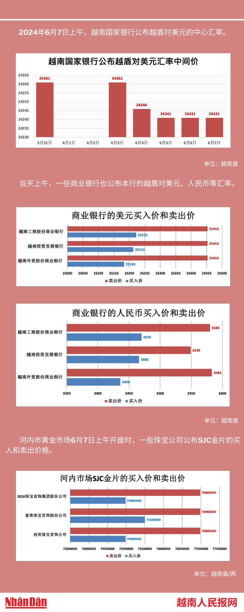 2024年6月7日上午,越南国家银行所公布的越盾对美元的中心汇率为24241。