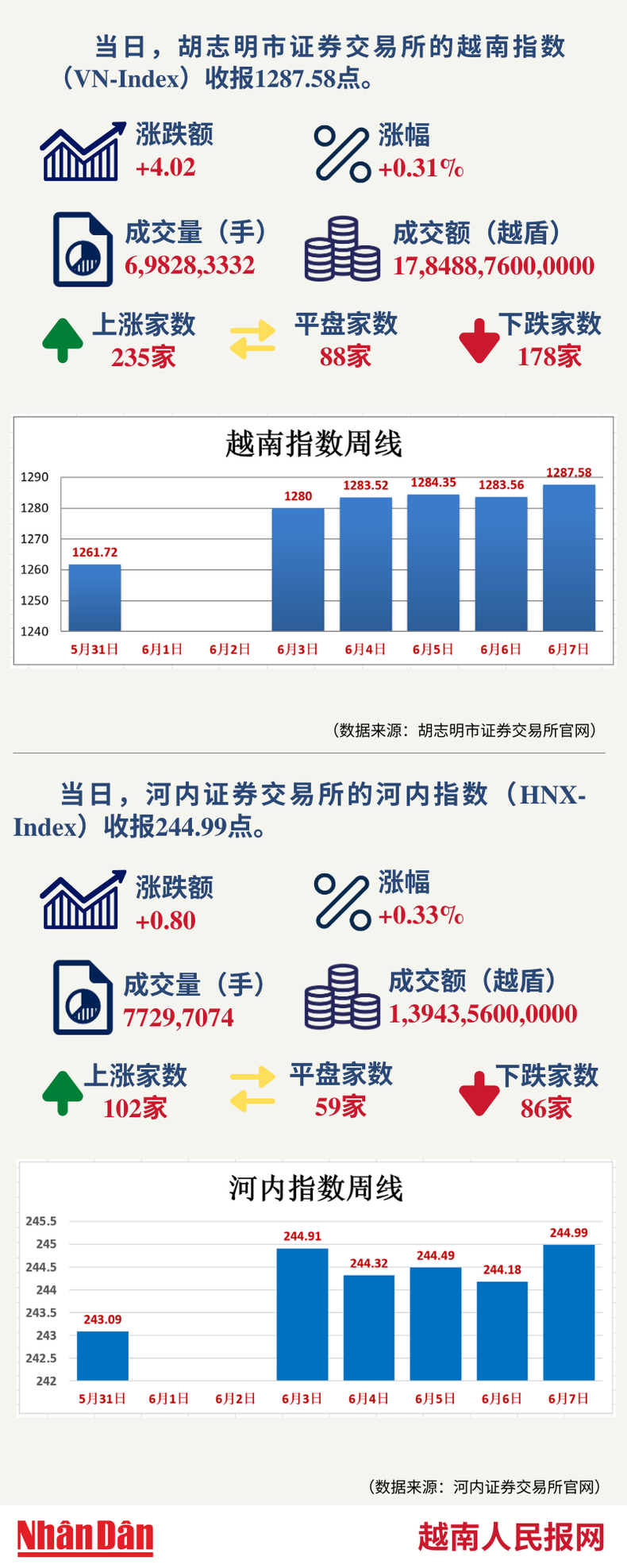 当天,胡志明市证券交易所的越南指数(VN-Index)和河内证券交易所的河内指数(HNX-Index)分别收报1287.58和244.99点。