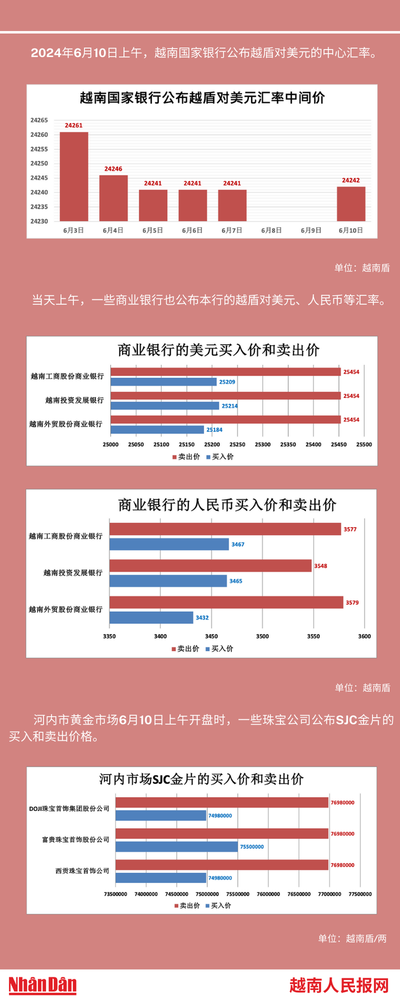 2024年6月10日上午,越南国家银行所公布的越盾对美元的中心汇率为24242。