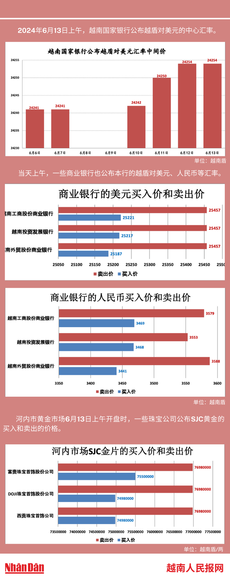 2024年6月13日上午,越南国家银行所公布的越盾对美元的中心汇率为24254。