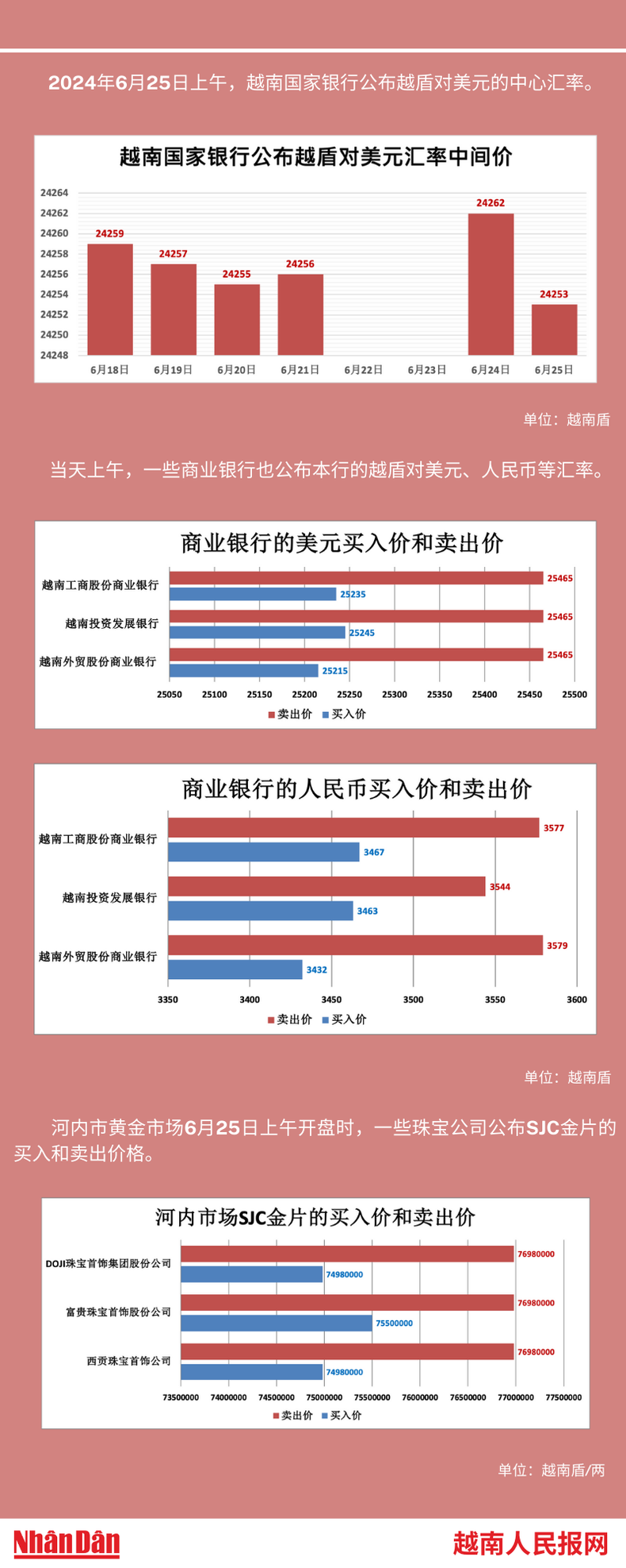 2024年6月25日上午,越南国家银行所公布的越盾对美元的中心汇率为24253。