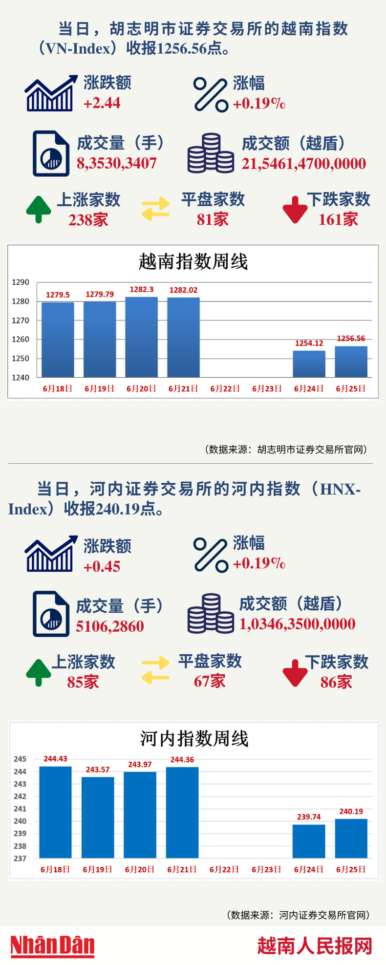 当天,胡志明市证券交易所的越南指数(VN-Index)和河内证券交易所的河内指数(HNX-Index)分别收报1256.56和240.19点。