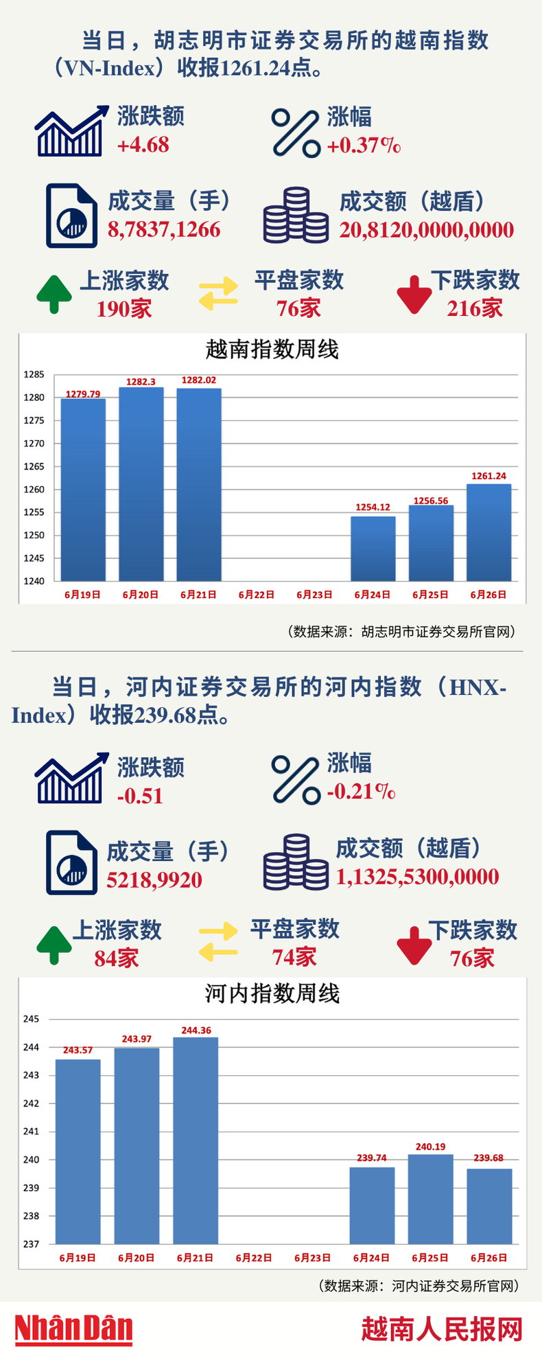 当天,胡志明市证券交易所的越南指数(VN-Index)和河内证券交易所的河内指数(HNX-Index)分别收报1261.24和239.68点。