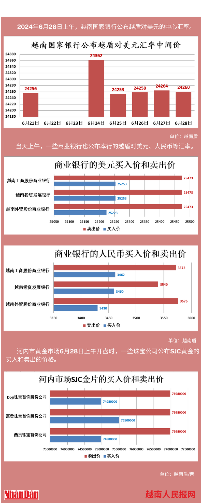 2024年6月28日上午,越南国家银行所公布的越盾对美元的中心汇率为24260。