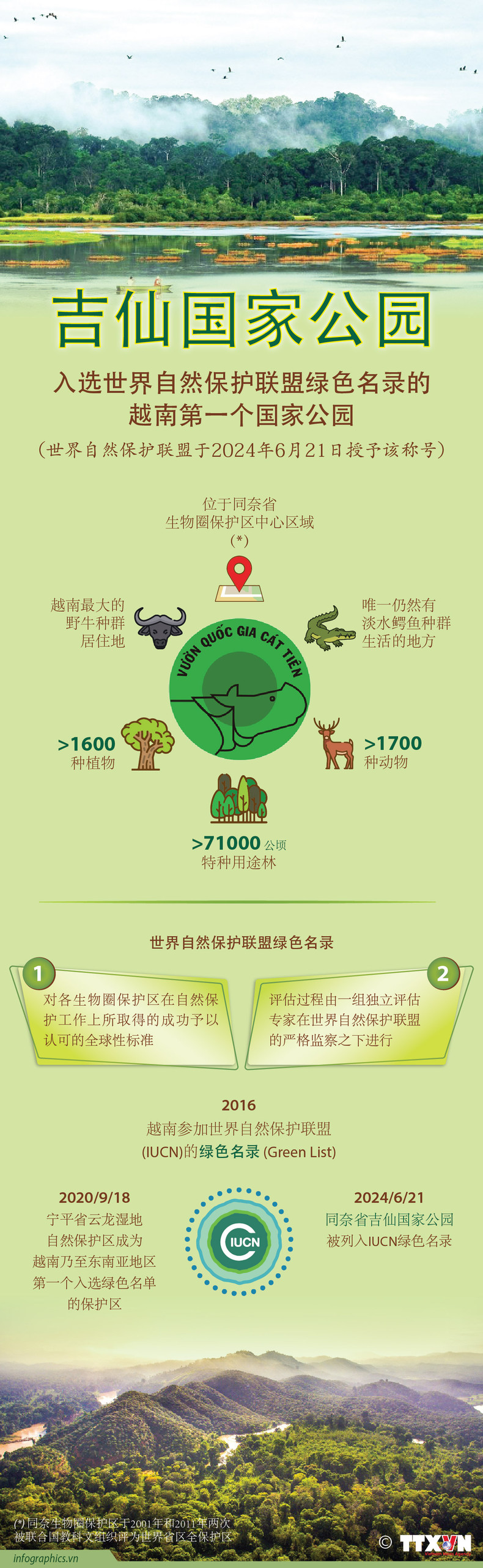 吉仙国家公园6月21日正式被列入世界自然保护联盟绿色名录。吉仙国家公园坐落在同奈省、林同省、平福省三省交界处,是世界上第72个和越南第二个荣获该称号的公园。
