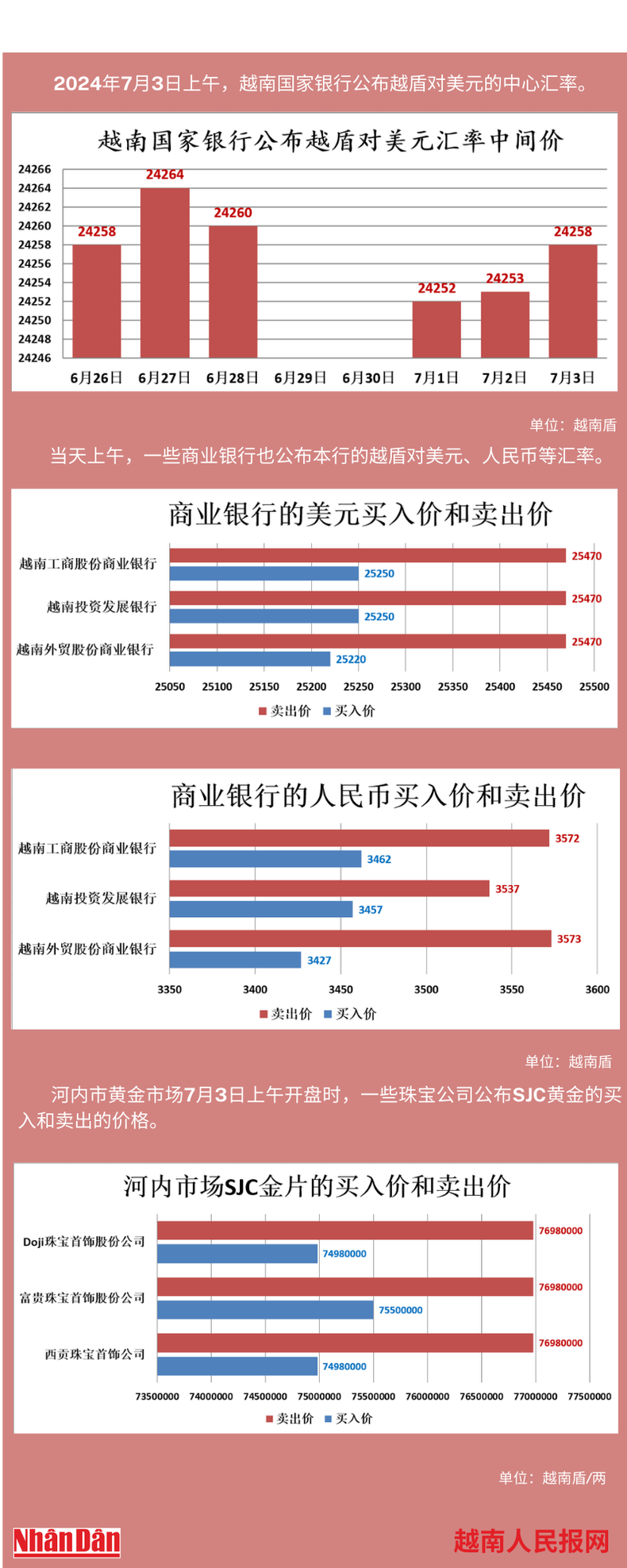 2024年7月3日上午,越南国家银行所公布的越盾对美元的中心汇率为24258。