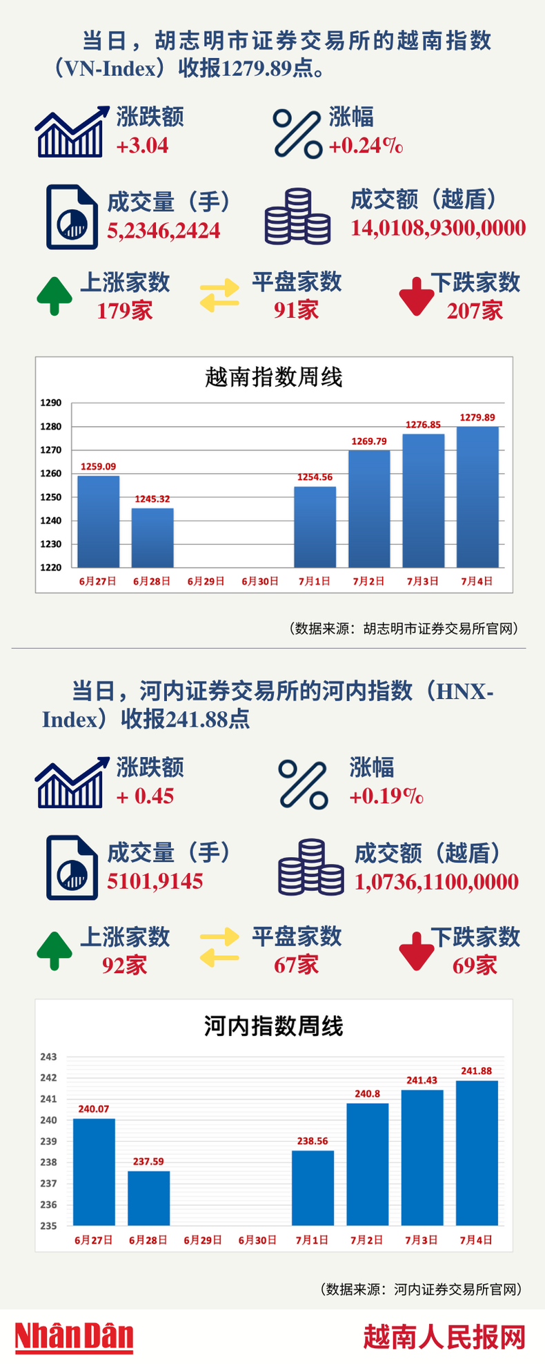 当天,胡志明市证券交易所的越南指数(VN-Index)和河内证券交易所的河内指数(HNX-Index)分别收报1279.89和241.88点。