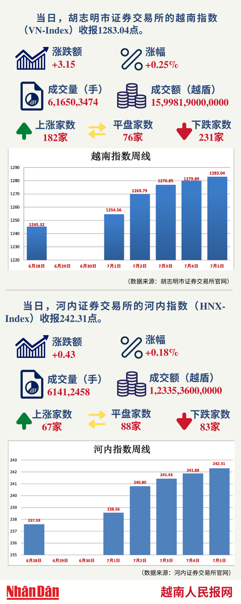 当天,胡志明市证券交易所的越南指数(VN-Index)和河内证券交易所的河内指数(HNX-Index)分别收报1283.04和242.31点。