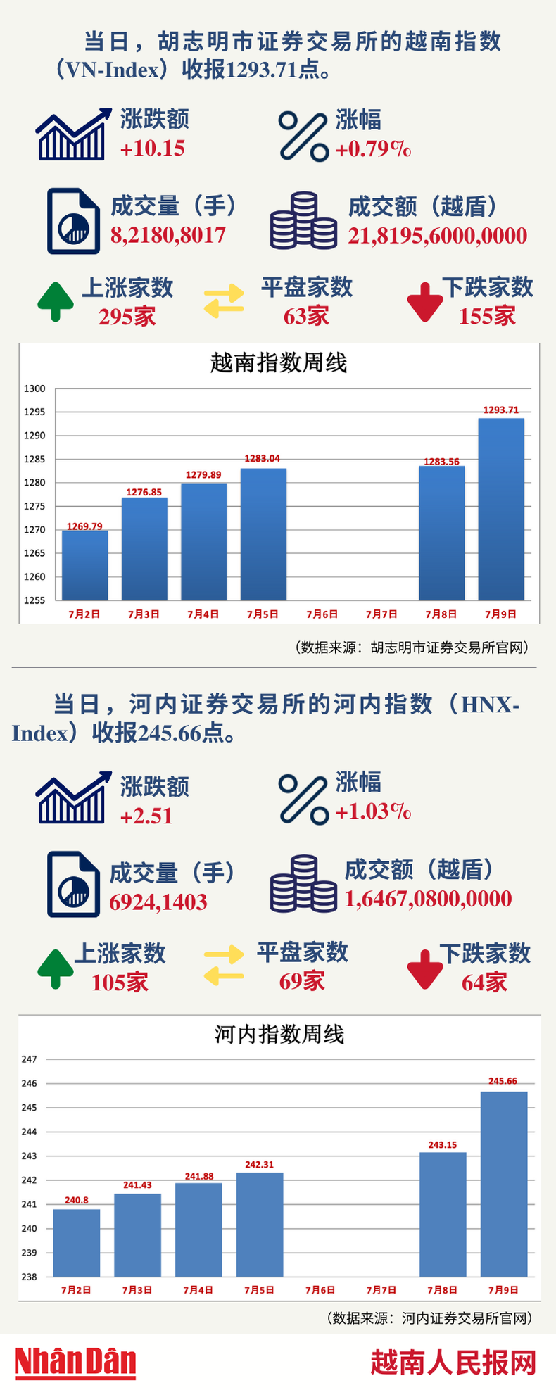 当天,胡志明市证券交易所的越南指数(VN-Index)和河内证券交易所的河内指数(HNX-Index)分别收报1293.71和245.66点。