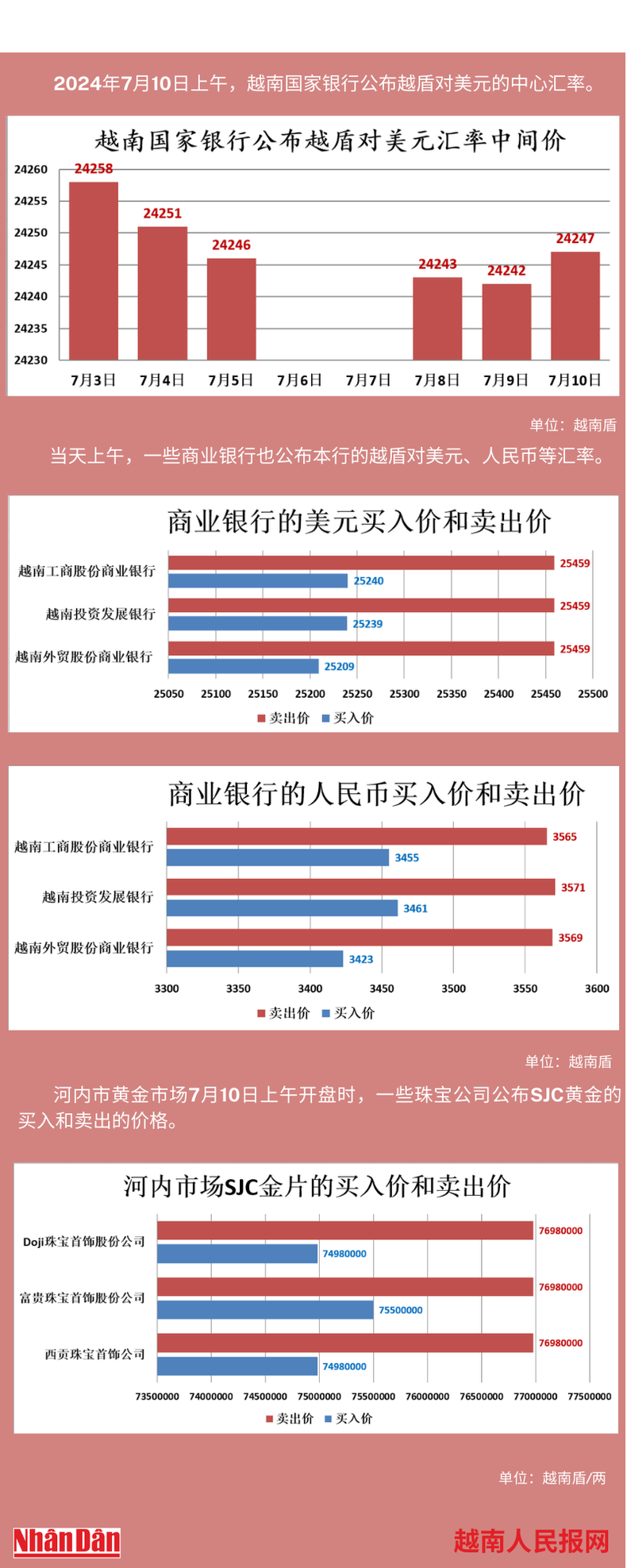 2024年7月10日上午,越南国家银行所公布的越盾对美元的中心汇率为24247。