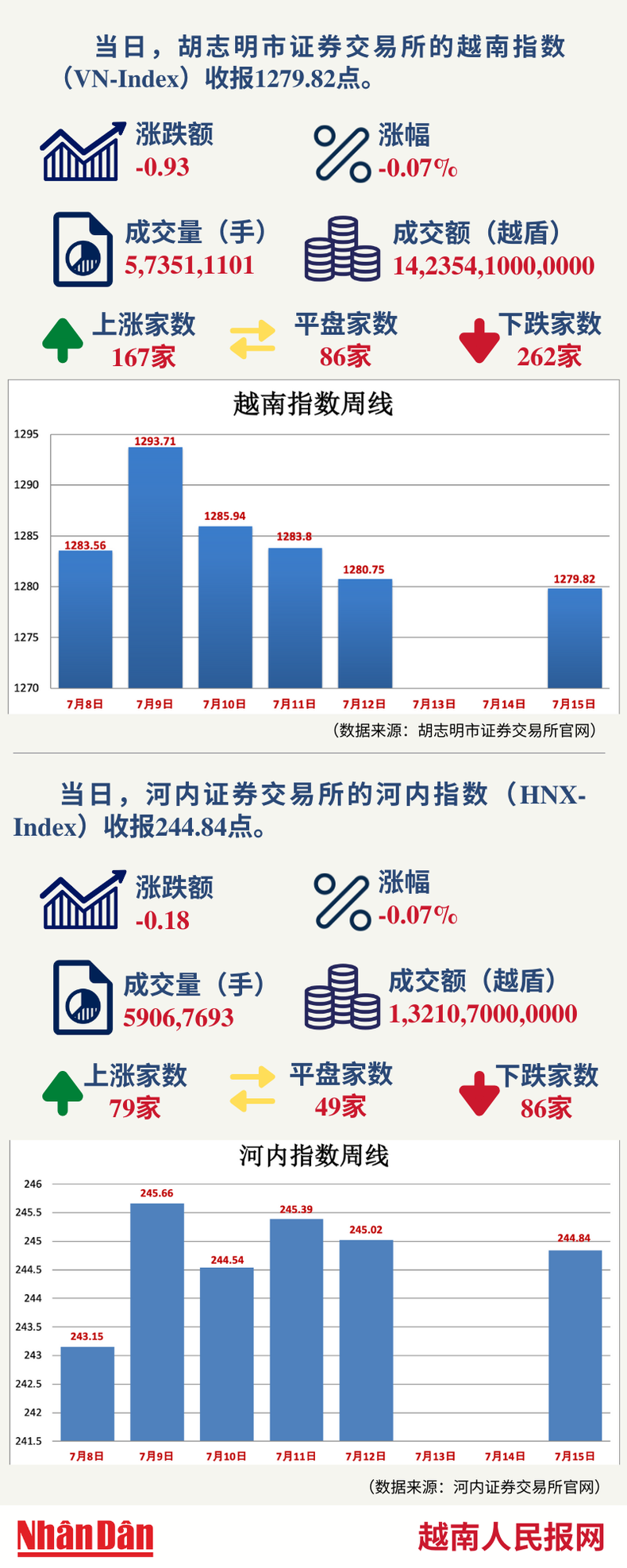 当天,胡志明市证券交易所的越南指数(VN-Index)和河内证券交易所的河内指数(HNX-Index)分别收报1279.82和244.84点。