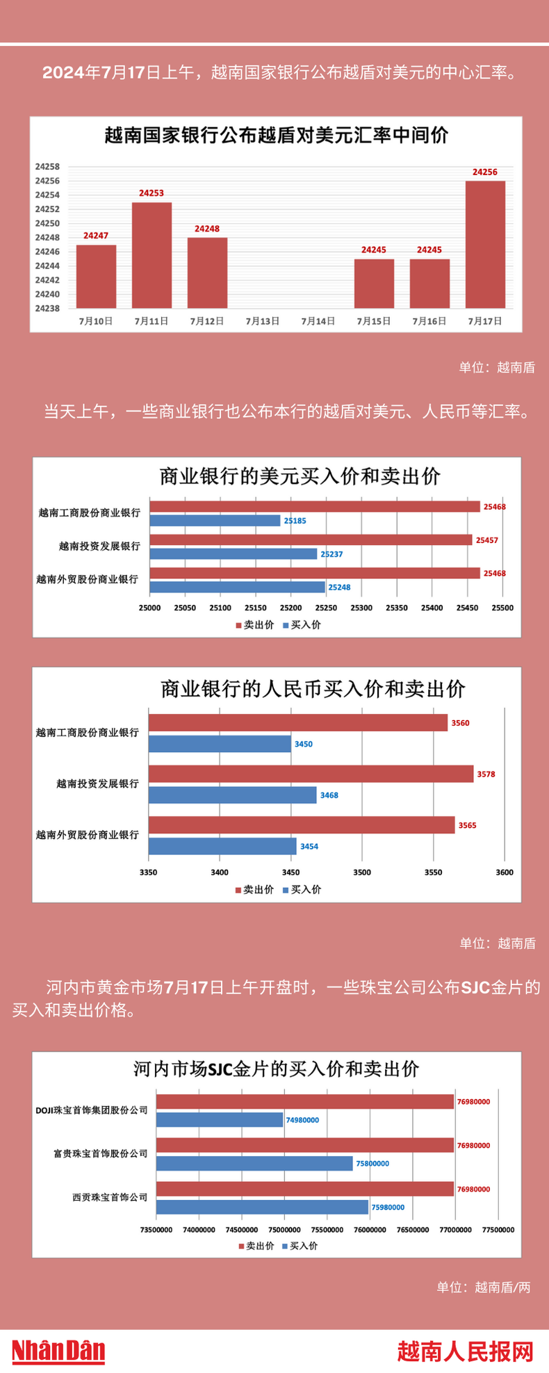 2024年7月17日上午,越南国家银行所公布的越盾对美元的中心汇率为24256。